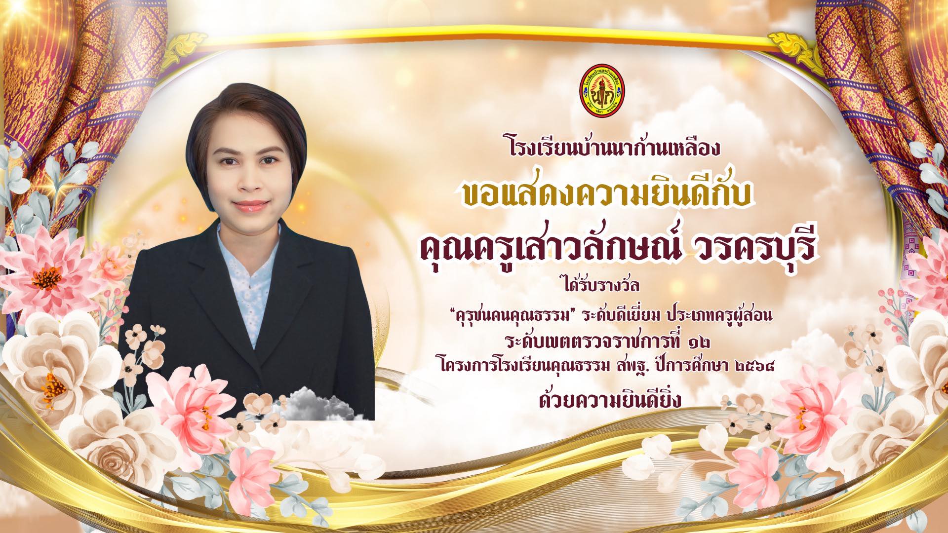 ขอแสดงความยินดีกับคุณครูเสาวลักษณ์ วรครบุรี ที่ได้รับรางวัลคุรุชน คนคุณธรรม ระดับดีเยี่ยม ระดับเขตตรวจราชการที่ 12