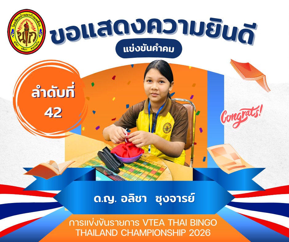 วันที่ 1 มกราคม 2569 โรงเรียนบ้านนาก้านเหลือง นำนักเรียนเข้าร่วมแข่งขันรายการ VTEA THAI BINGO THAILAND CHAMPIONSHIP 2026 ระดับประเทศ เพื่อส่งเสริมให้นักเรียนได้พัฒนาทักษะวิชาการผ่านการแข่งขันระดับประเทศ เสริมสร้างความมั่นใจความกล้าแสดงออก การคิดวิเคราะห์และการวางแผน พร้อมเปิดโอกาสให้นักเรียนได้เรียนรู้ประสบการณ์นอกห้องเรียนเพื่อยกระดับศักยภาพสู่ความเป็นเลิศ