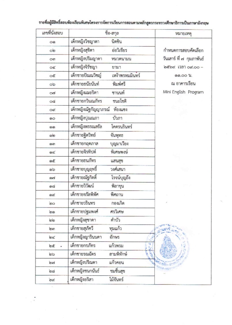 เรื่อง รายชื่อผู้มีสิทธิ์สอบคัดเลือกห้องเรียนพิเศษ MEP1 ประจำปีการศึกษา 2569