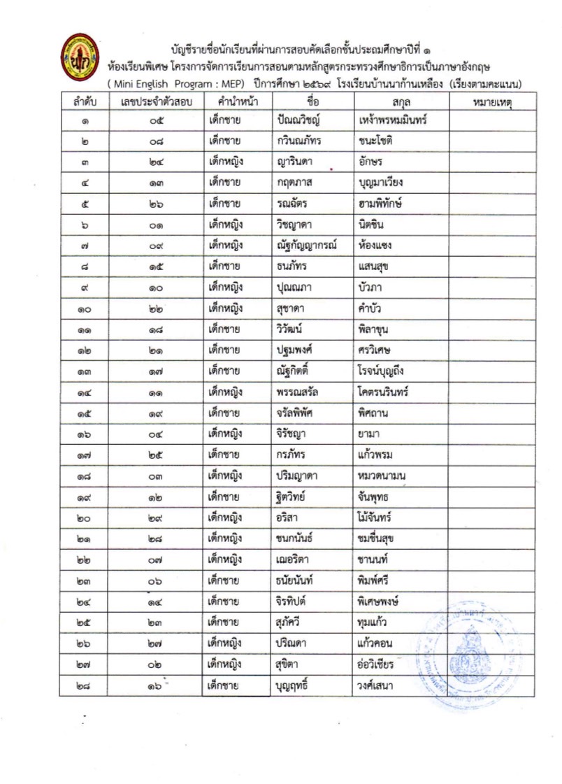ประกาศโรงเรียนบ้านนาก้านเหลืองเรื่อง ประกาศผลการสอบคัดเลือกนักเรียนเข้าเรียนห้องเรียนพิเศษ MEP1 ประจำปีการศึกษา 2569เอกสารประกาศ https://shorturl.at/t5hMzเอกสารรายชื่อ https://shorturl.at/QBKk2