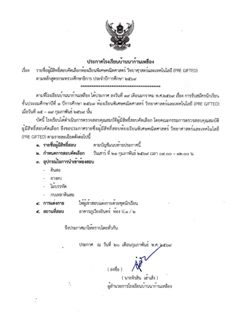 ประกาศ รายชื่อผู้มีสิทธิ์สอบคัดเลือกห้องเรียนพิเศษคณิตศาสตร์ วิทยาศาสตร์และเทคโนโลยี (PRE GIFTED) ประจำปีการศึกษา 2569