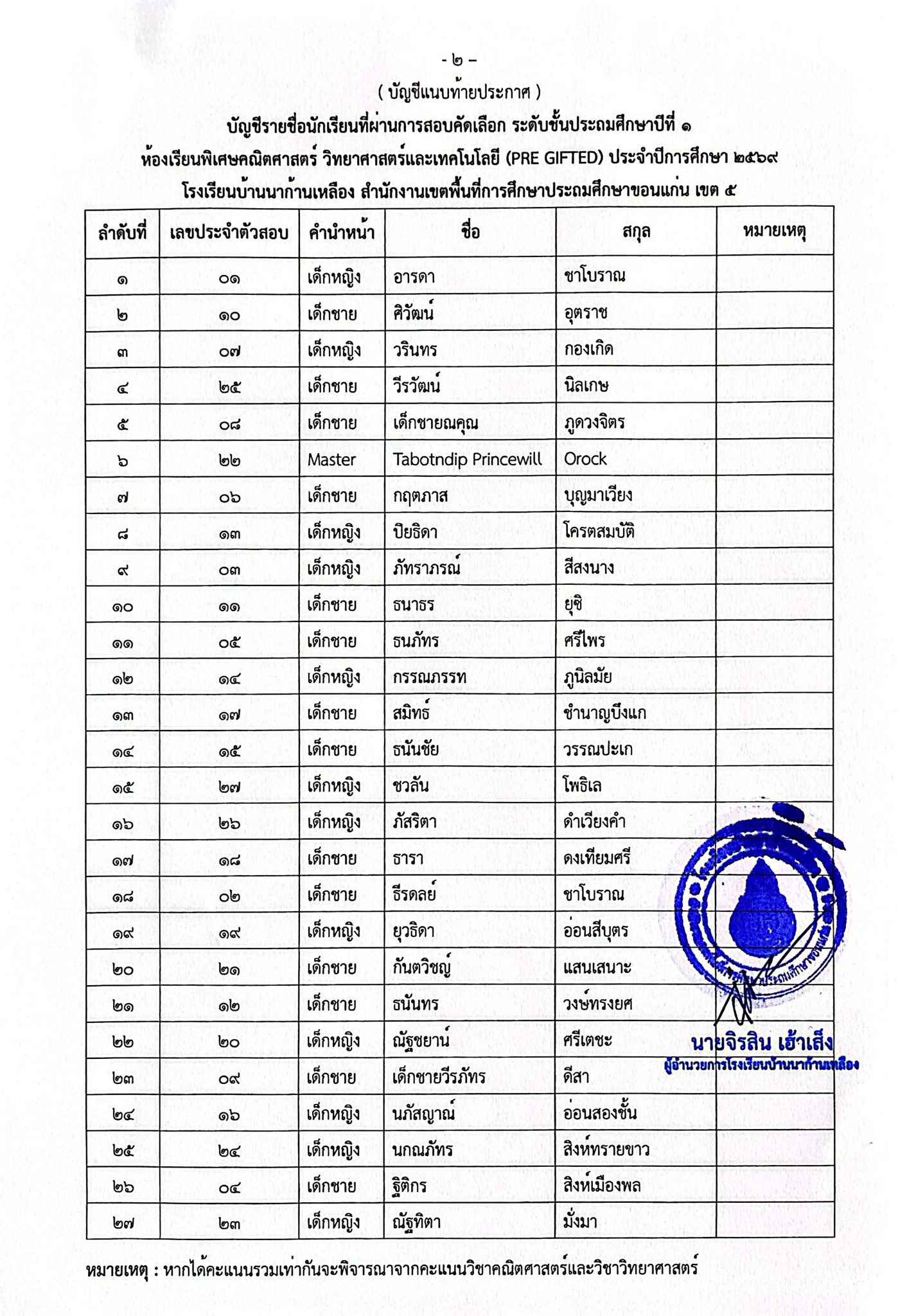 เรื่อง ผลการสอบคัดเลือกห้องเรียนพิเศษคณิตศาสตร์ วิทยาศาสตร์และเทคโนโลยี (PRE GIFTED) ประจำปีการศึกษา 2569