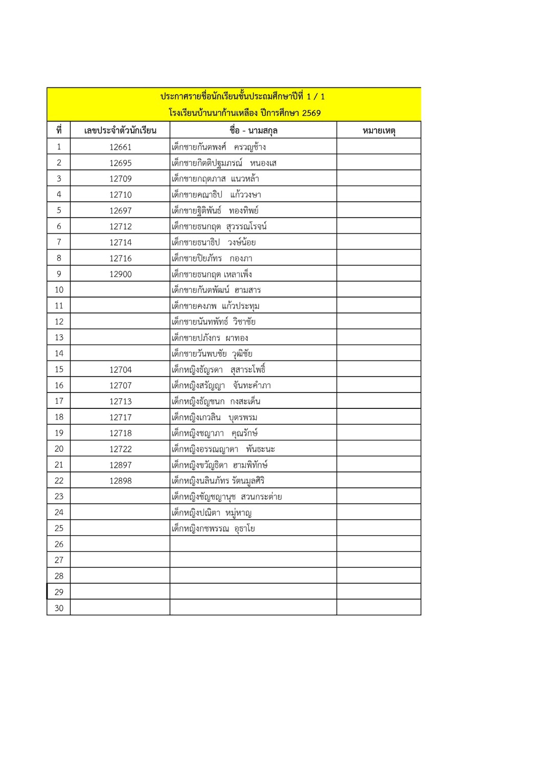 ประกาศ รายชื่อนักเรียนระดับชั้นประถมศึกษาปีที่ 1 ปีการศึกษา 2569 (ห้องเรียนปกติ)