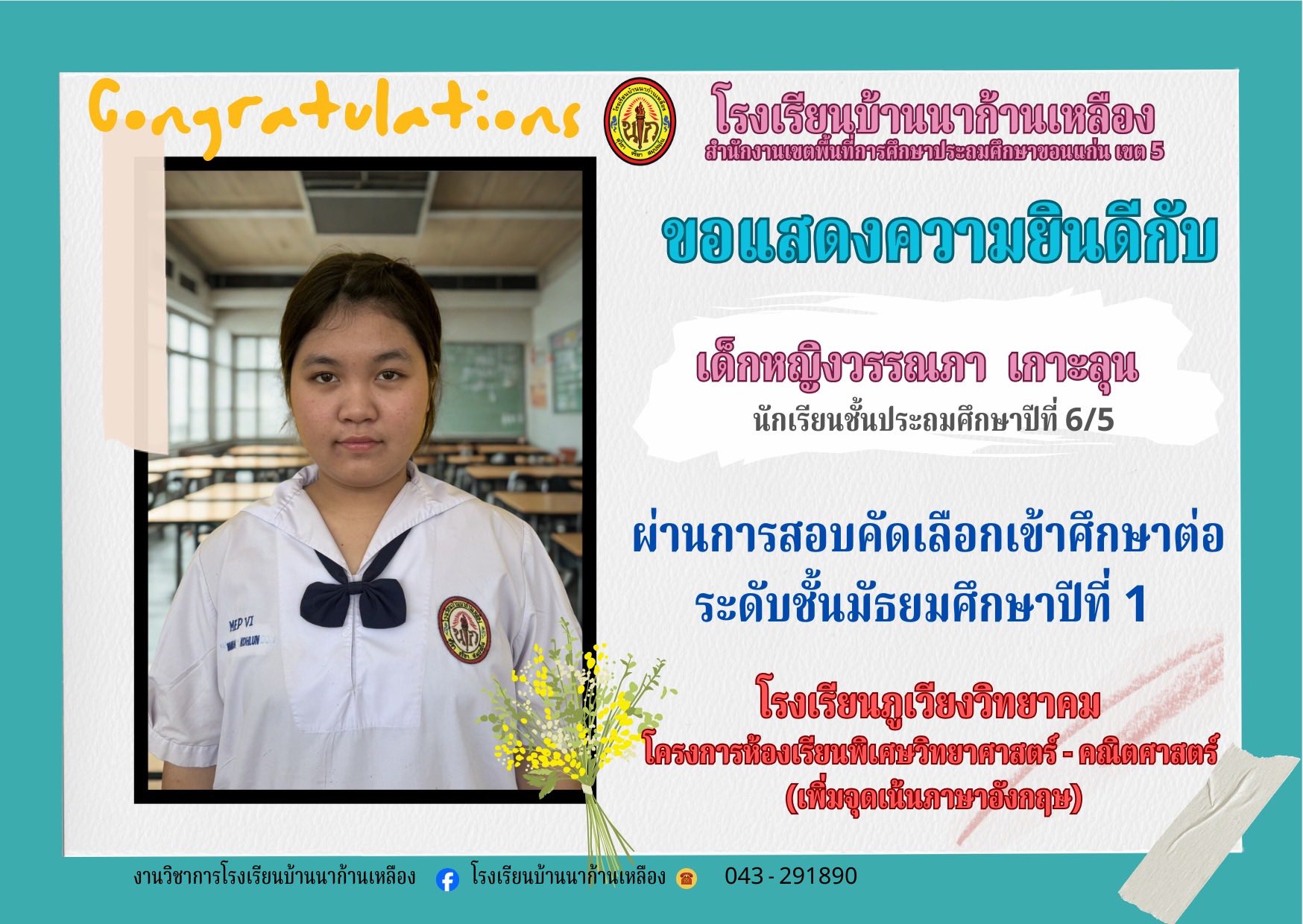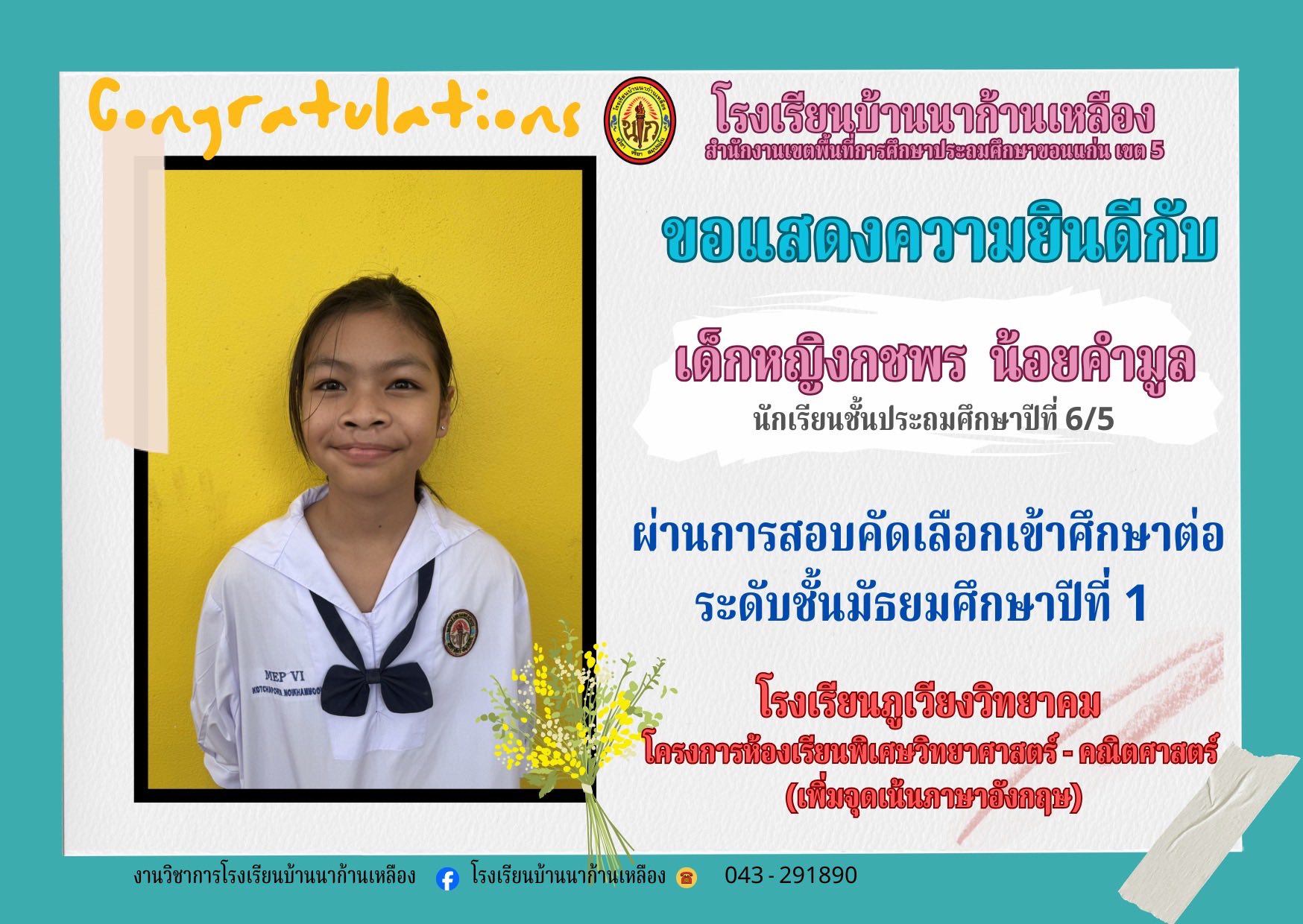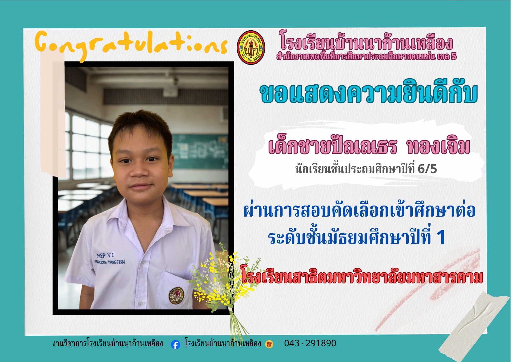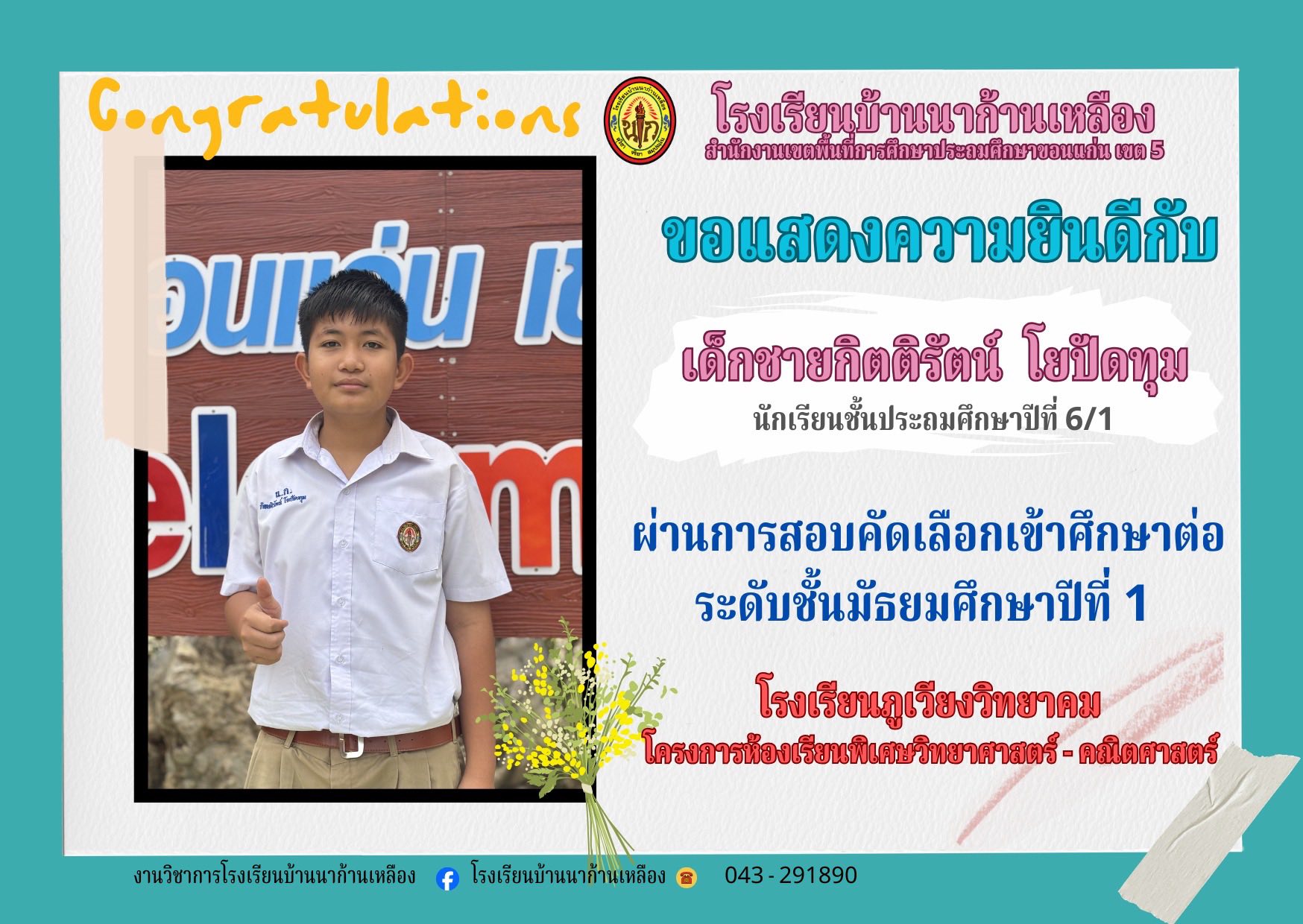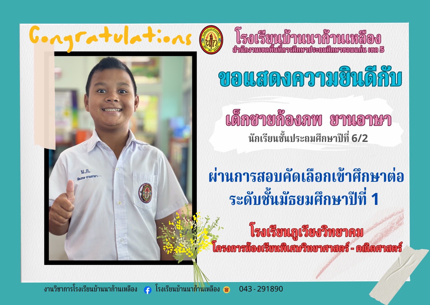 โรงเรียนบ้านนาก้านเหลือง ขอแสดงความยินดีกับนักเรียนคนเก่งในการสอบเรียนต่อระดับมัธยมศึกษา