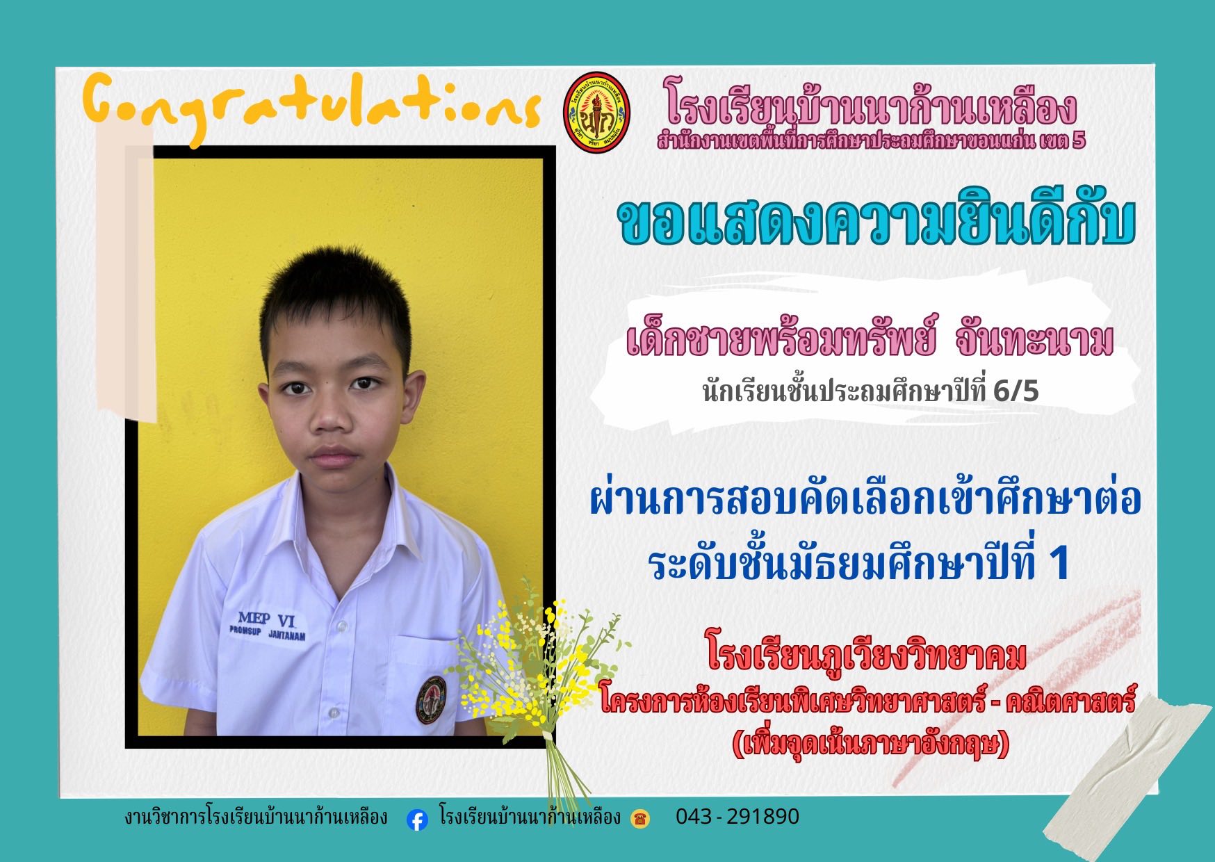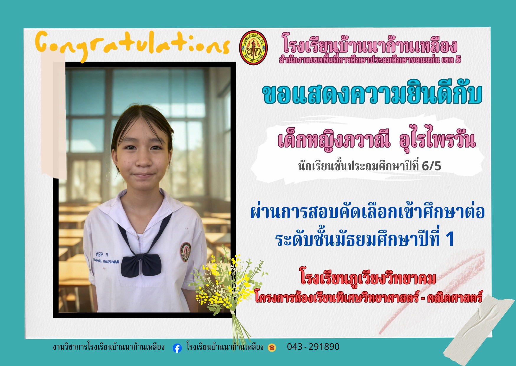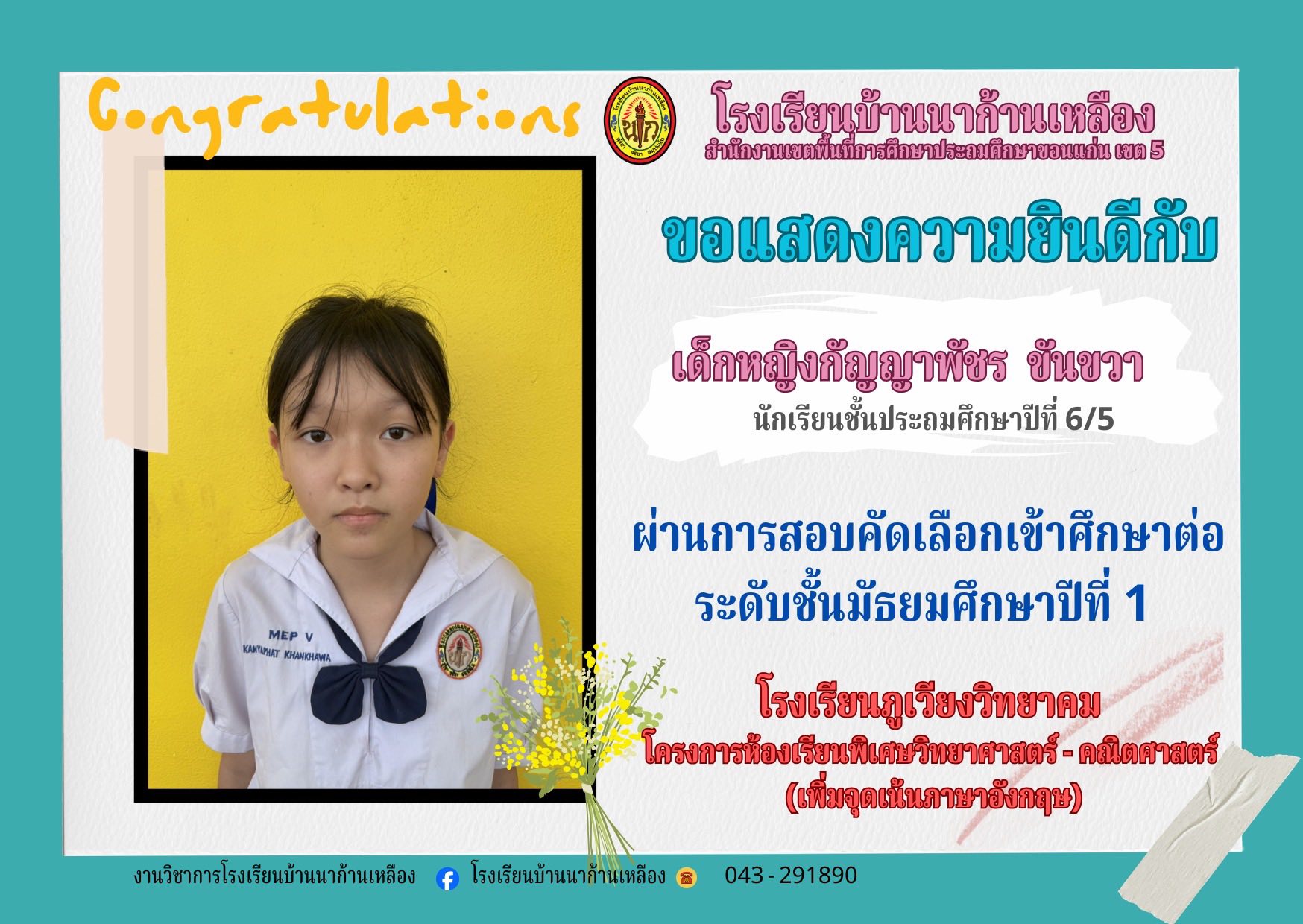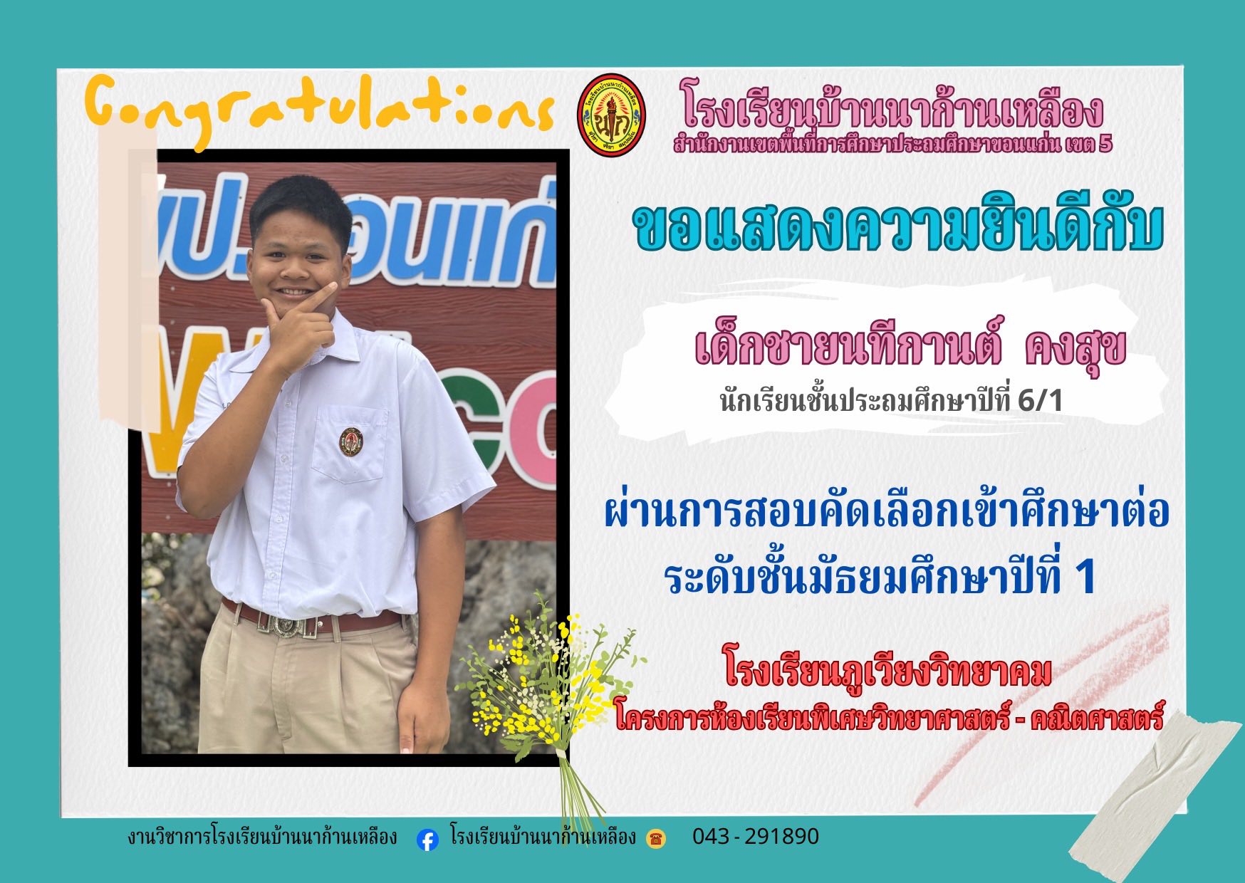 โรงเรียนบ้านนาก้านเหลือง ขอแสดงความยินดีกับนักเรียนคนเก่งในการสอบเรียนต่อระดับมัธยมศึกษา