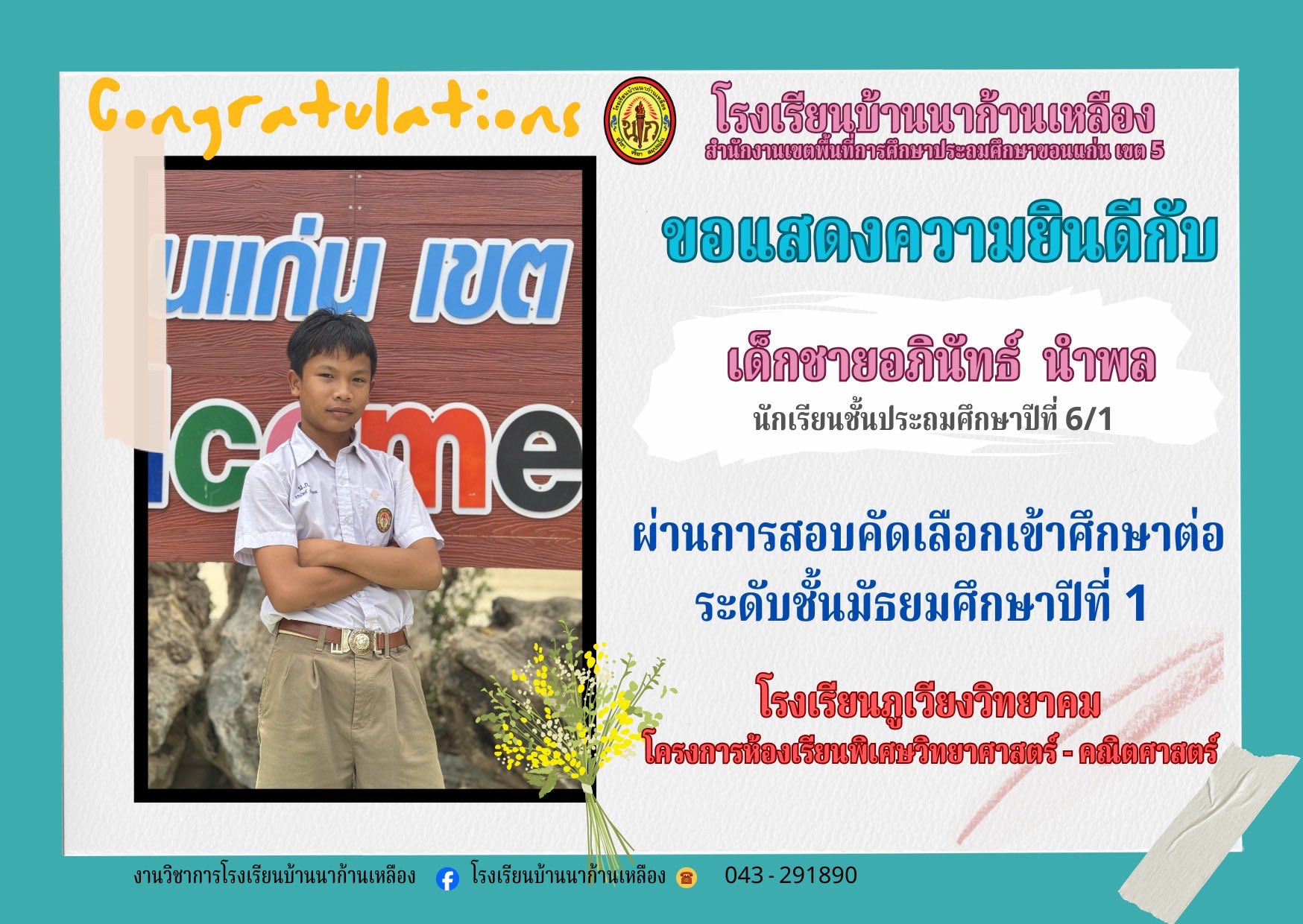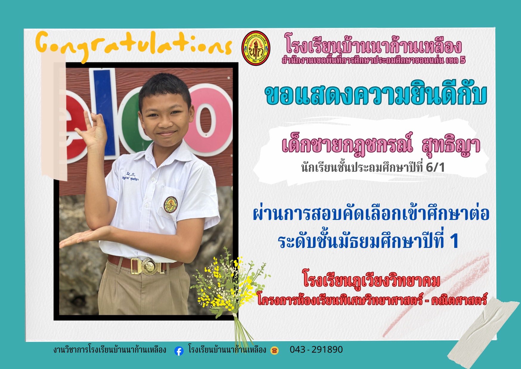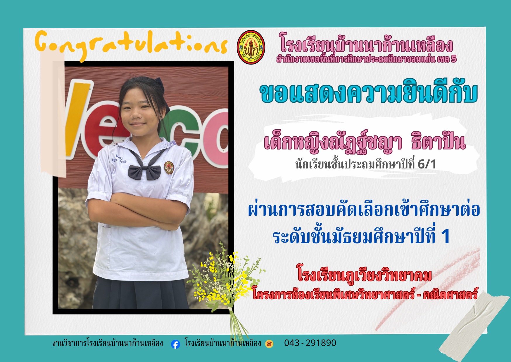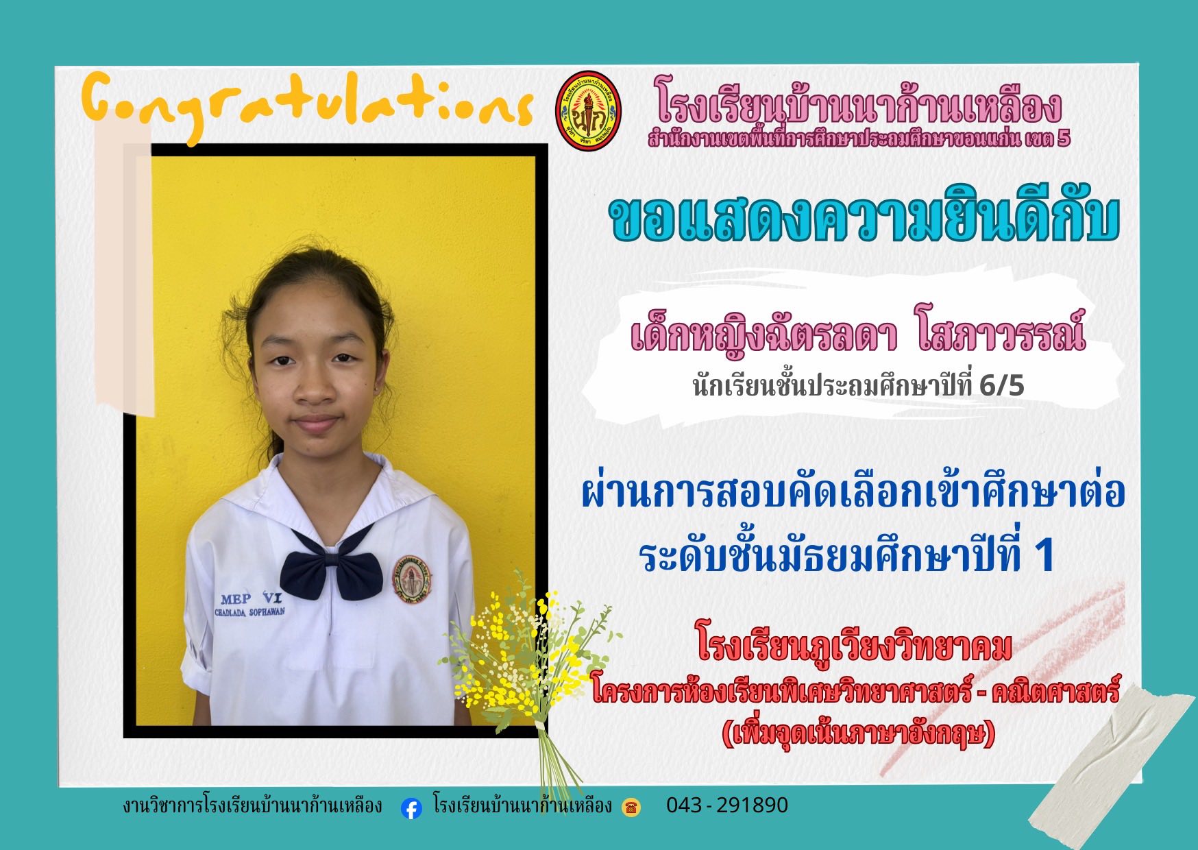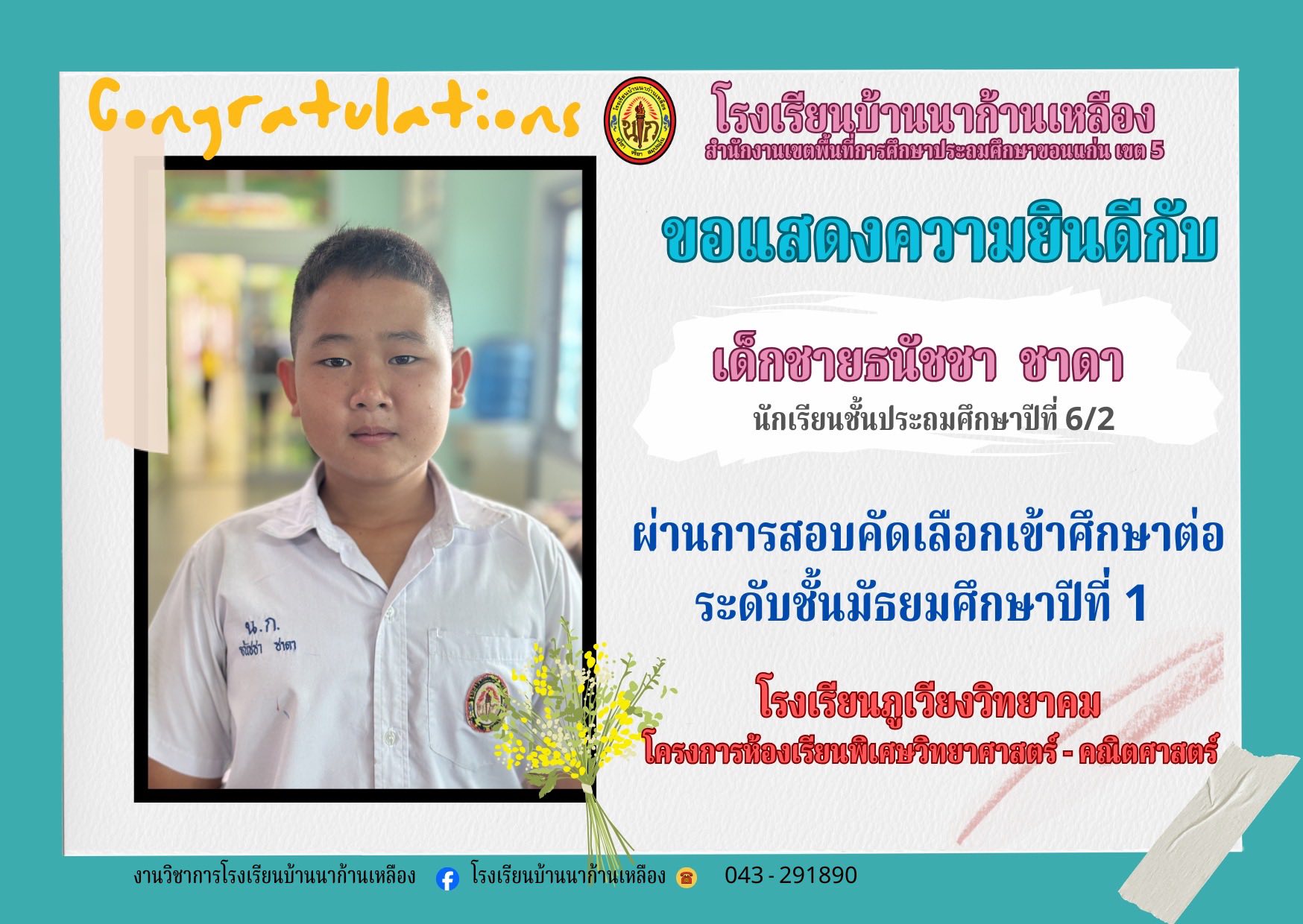 โรงเรียนบ้านนาก้านเหลือง ขอแสดงความยินดีกับนักเรียนคนเก่งในการสอบเรียนต่อระดับมัธยมศึกษา