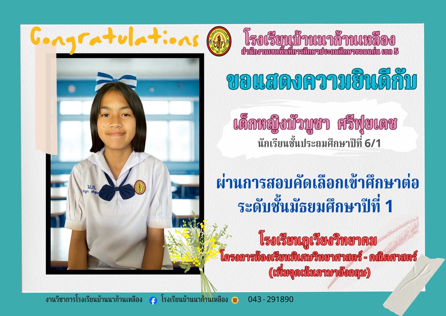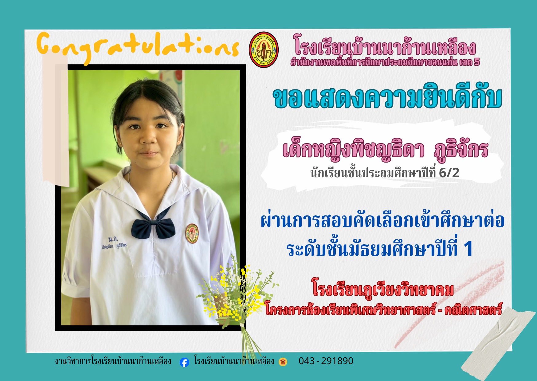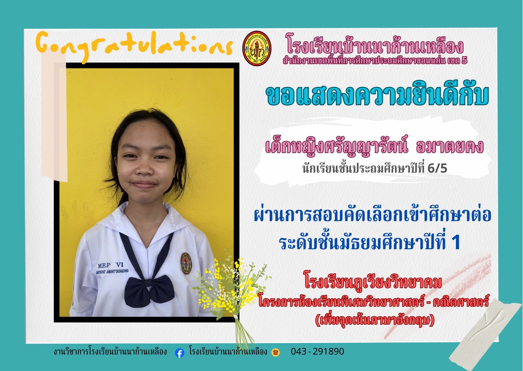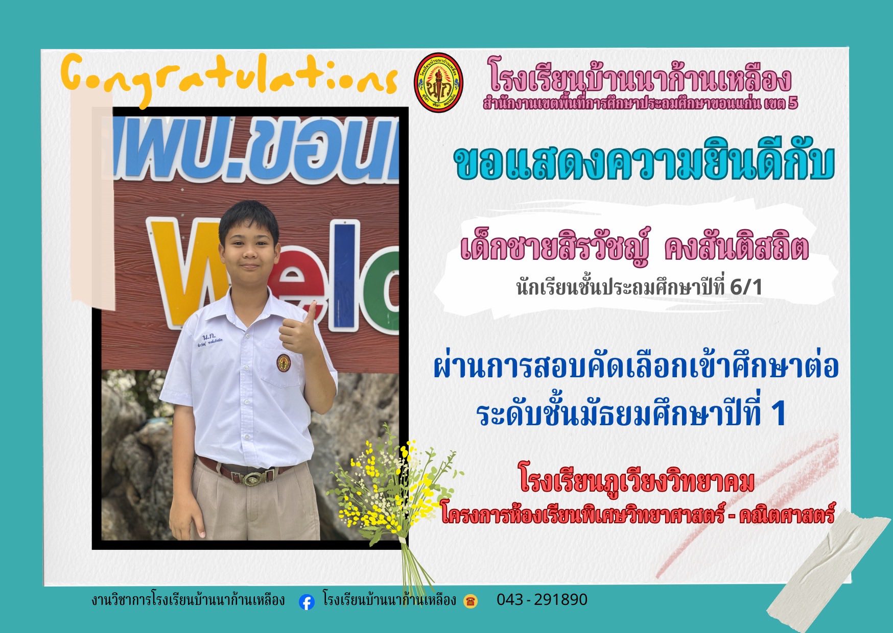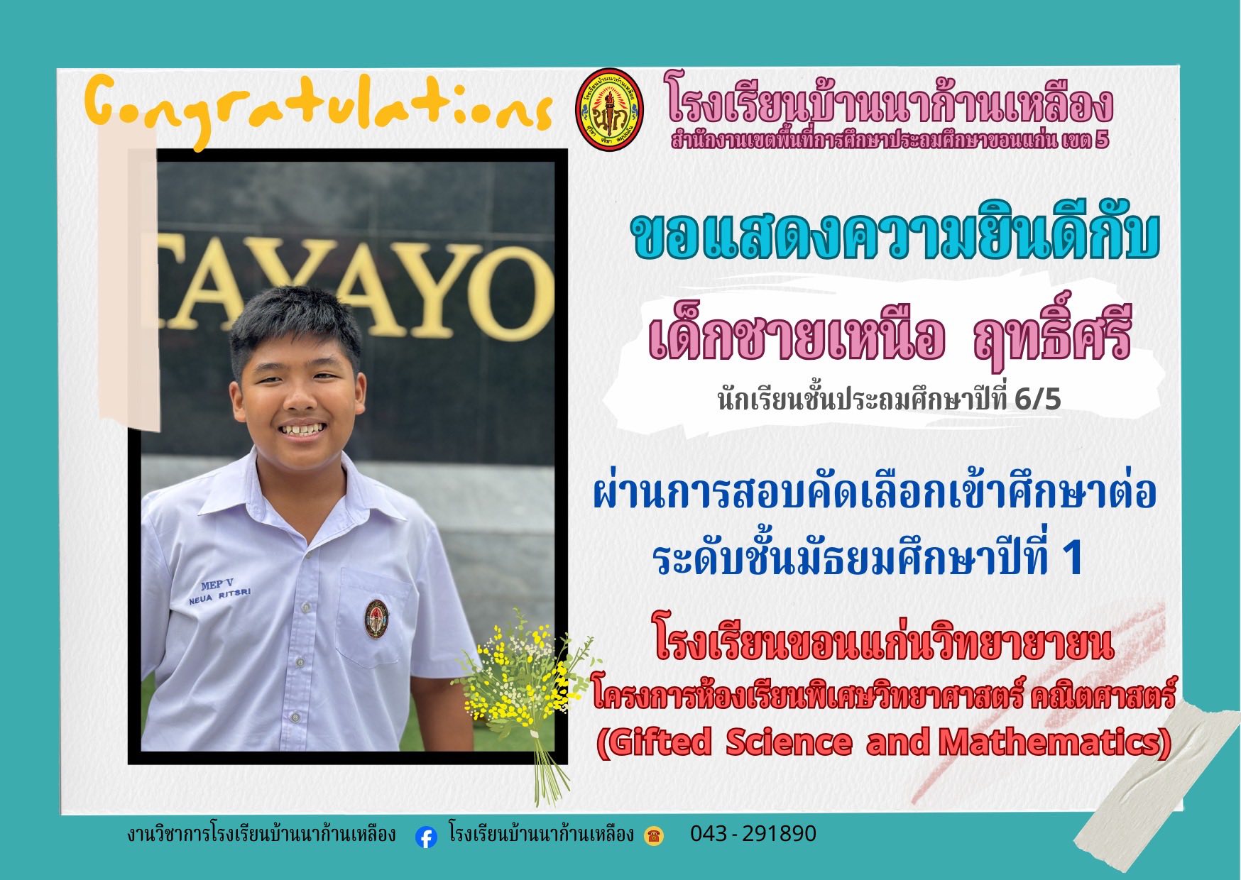 โรงเรียนบ้านนาก้านเหลือง ขอแสดงความยินดีกับนักเรียนคนเก่งในการสอบเรียนต่อระดับมัธยมศึกษา