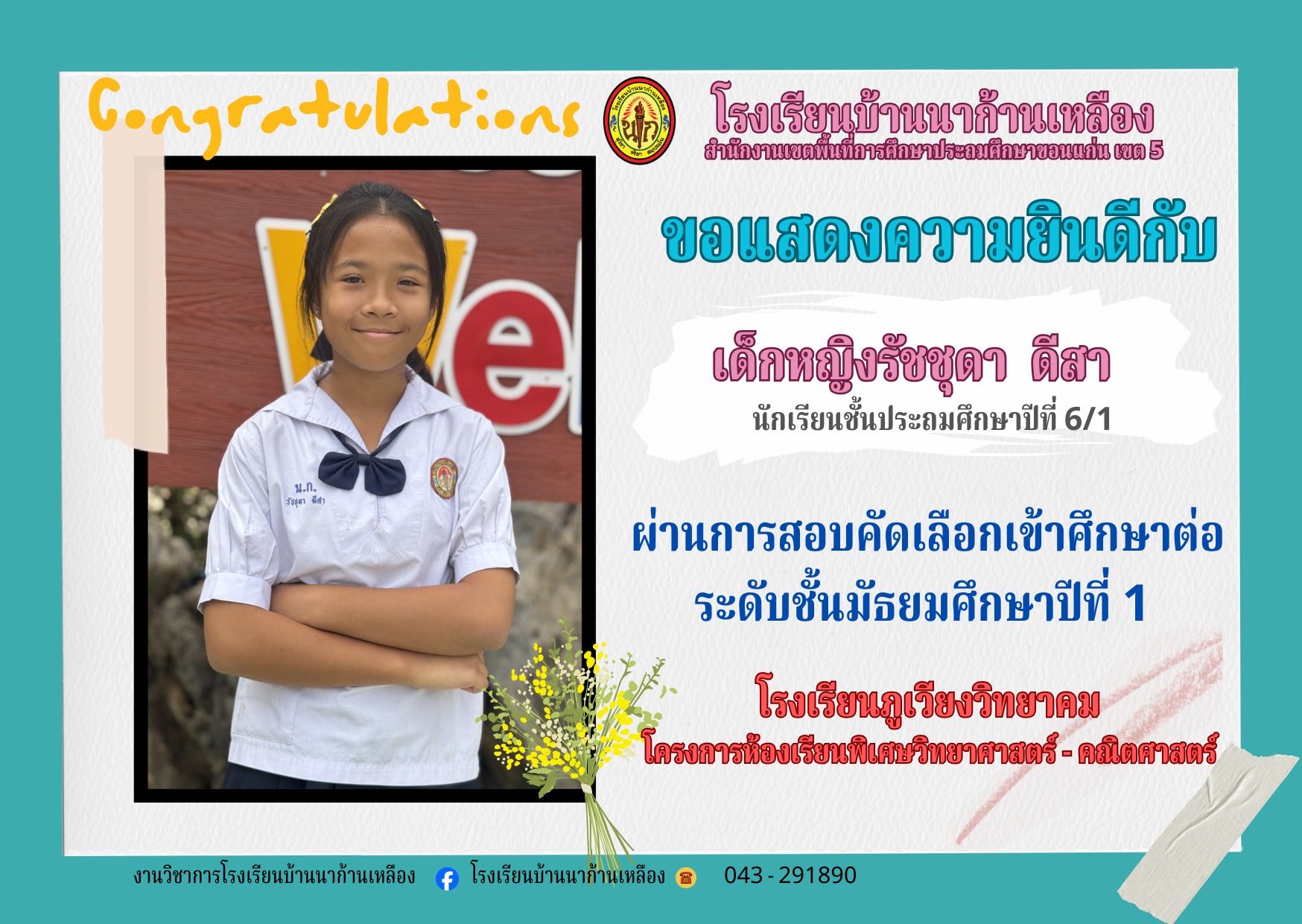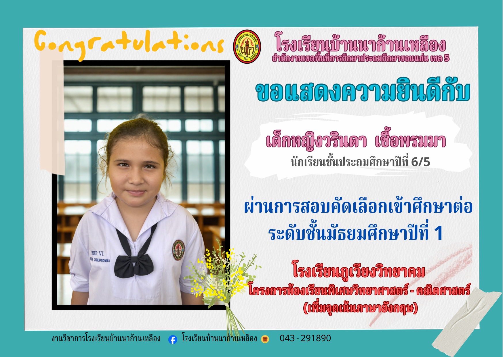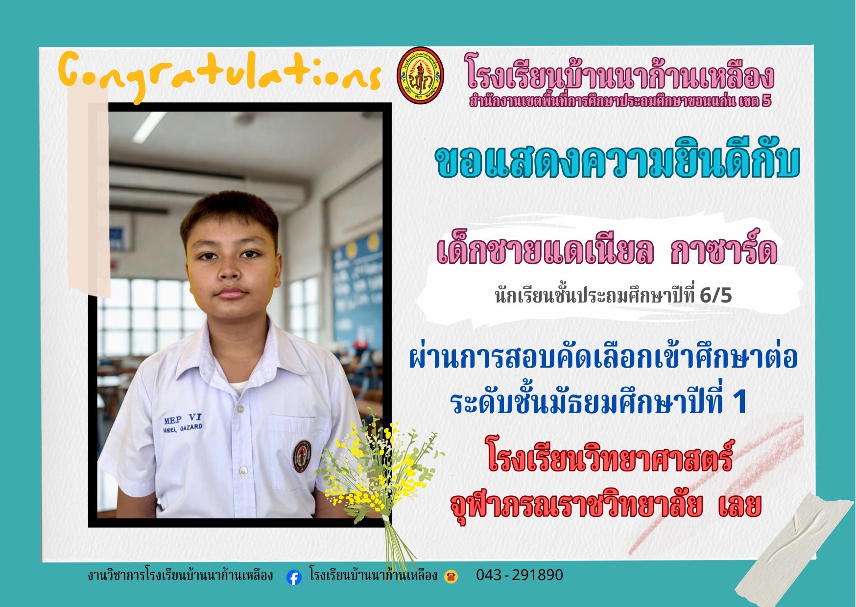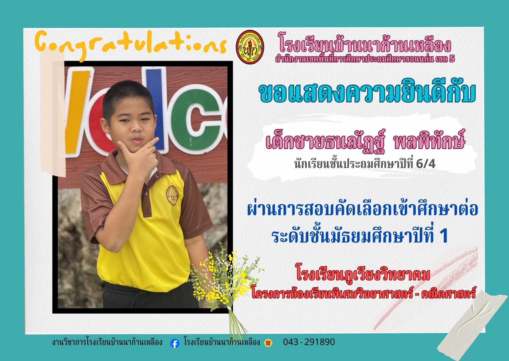 โรงเรียนบ้านนาก้านเหลือง ขอแสดงความยินดีกับนักเรียนคนเก่งในการสอบเรียนต่อระดับมัธยมศึกษา