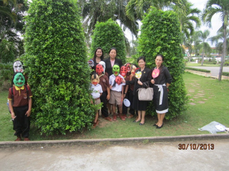 นักเรียนทำหน้ากากปิดบังหน้าตนเองเป็นรูปภูตผี ปีศาจ แสดงท่าทางน่ากล้ว และเต้นประกอบเพลง อย่างสนุกสนาน