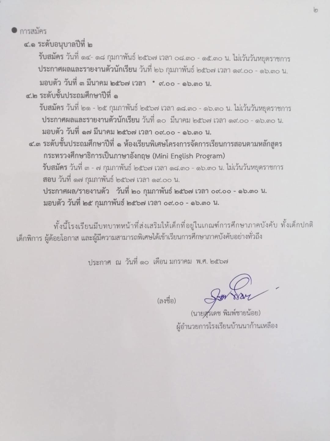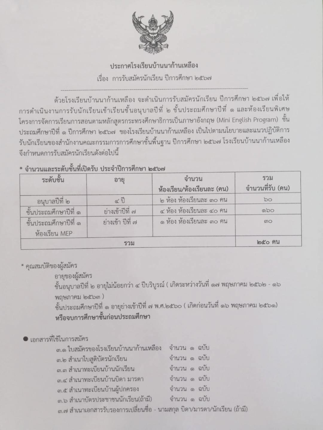 ประกาศโรงเรียนบ้านนาก้านเหลือง เรื่อง การรับสมัครเรียน ปีการศึกษา 2567