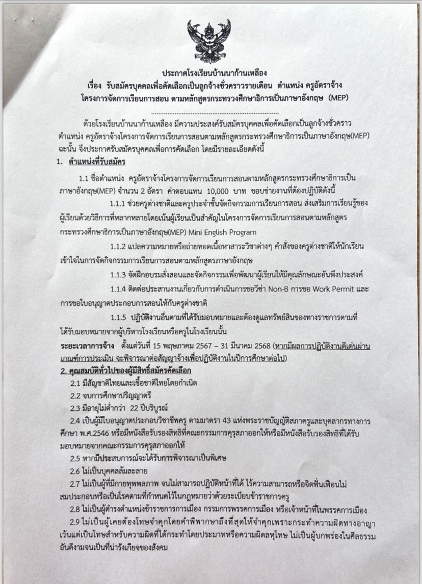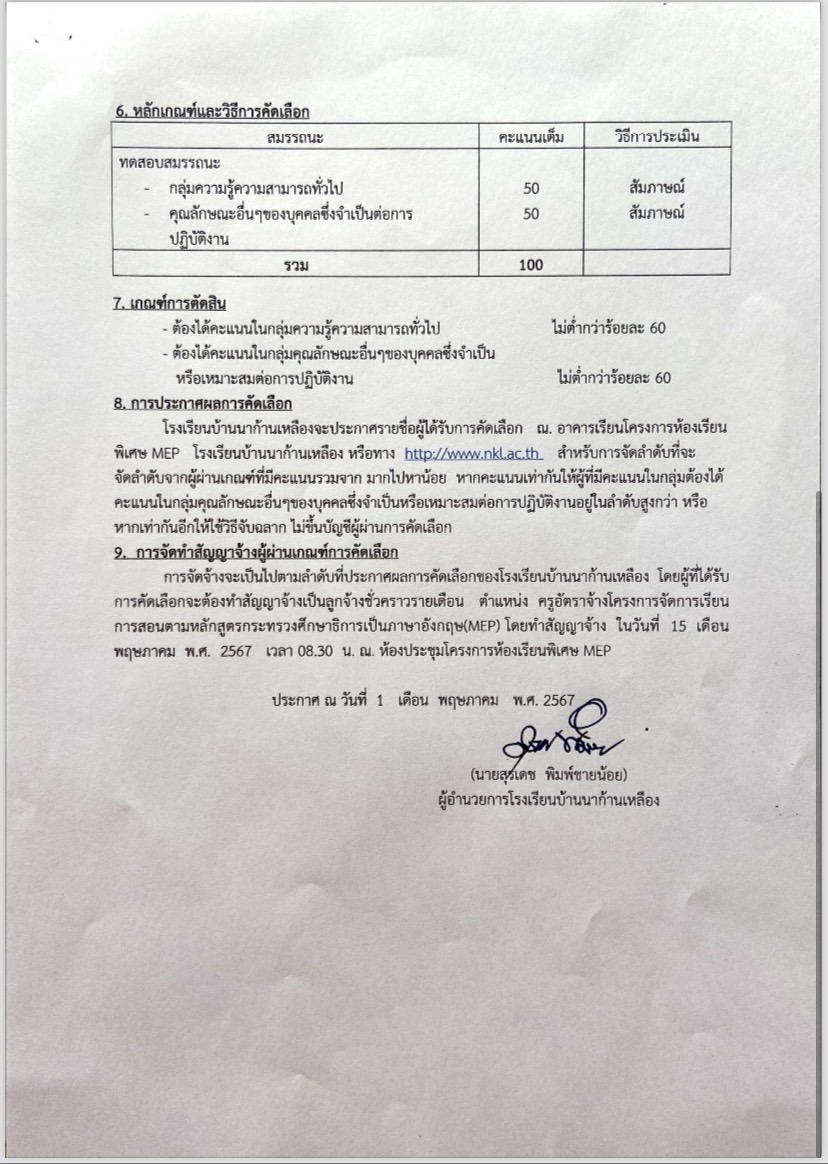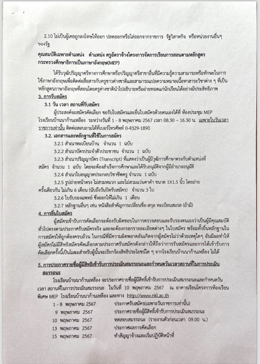 เรื่อง รับสมัครครูอัตราจ้างห้องเรียนพิเศษ MEP