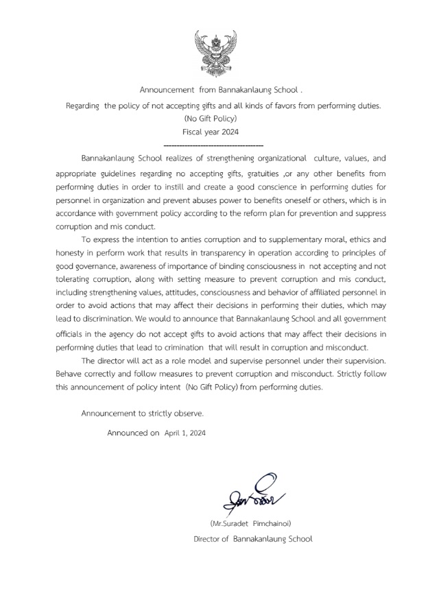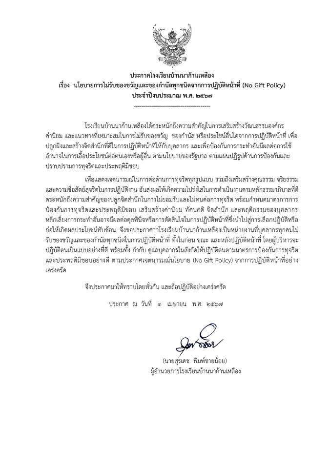 โรงเรียนบ้านนาก้านเหลือง ขอประกาศเจตนารมณ์นโยบาย