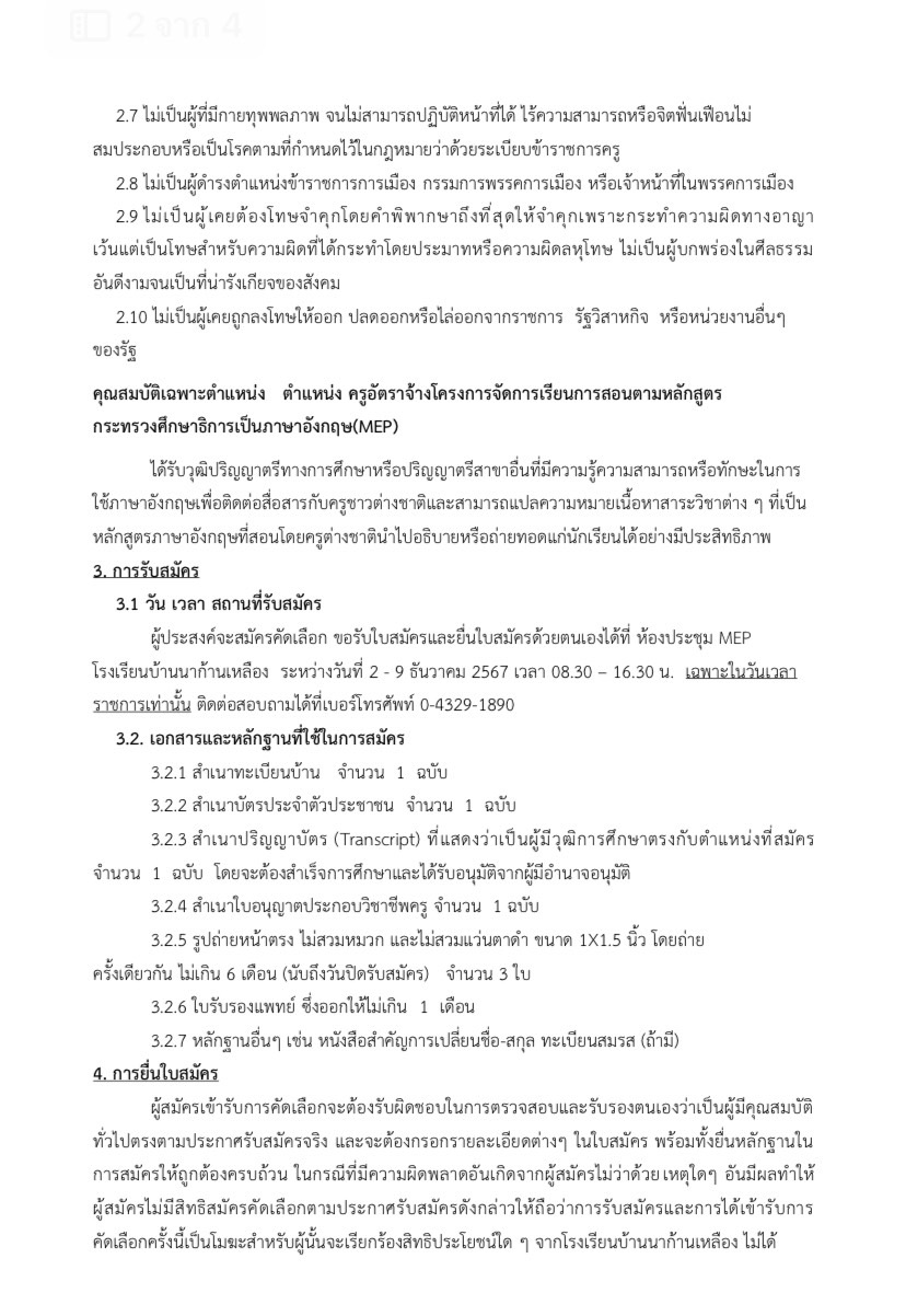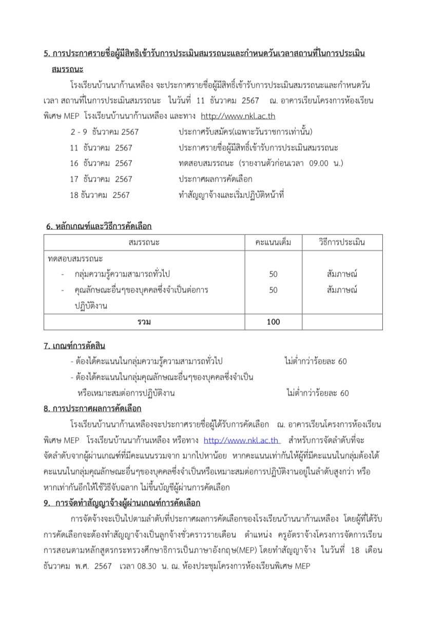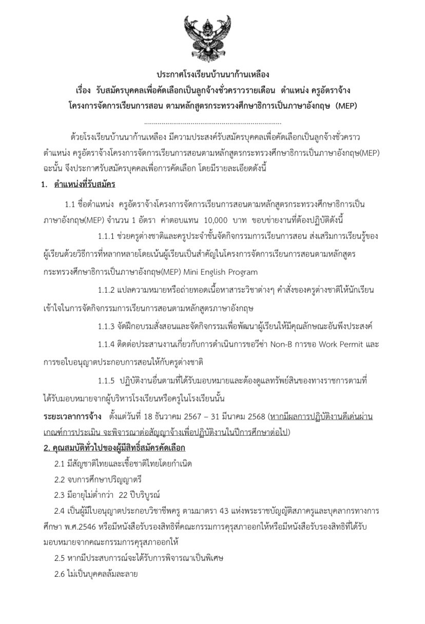 ประกาศโรงเรียนบ้านนาก้านเหลือง เรื่อง รับสมัครบุคคลเพื่อคัดเลือกเป็นลูกจ้างชั่วคราวรายเดือน ตำแหน่ง ครูอัตราจ้าง MEP