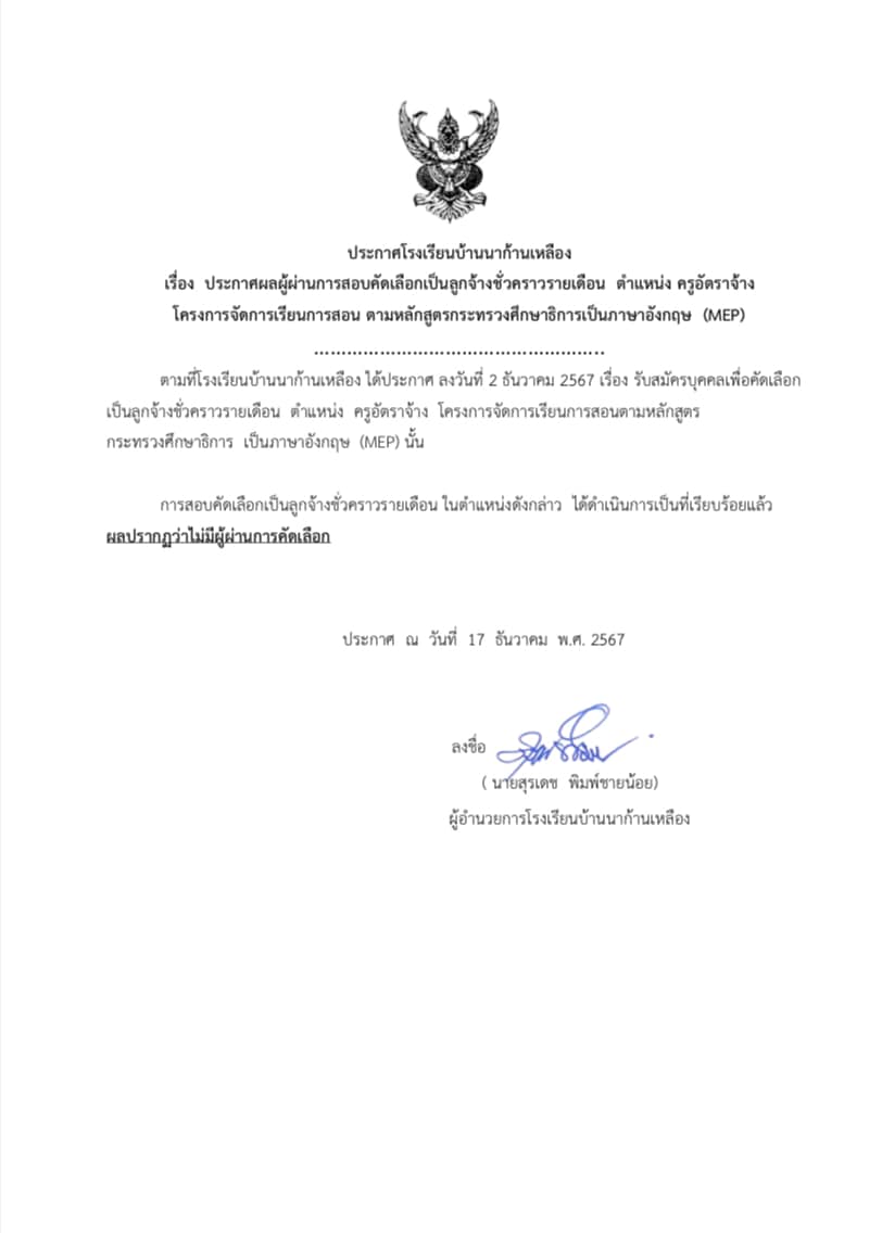 เรื่อง ผลการสอบคัดเลือก ครูอัตราจ้าง Mep