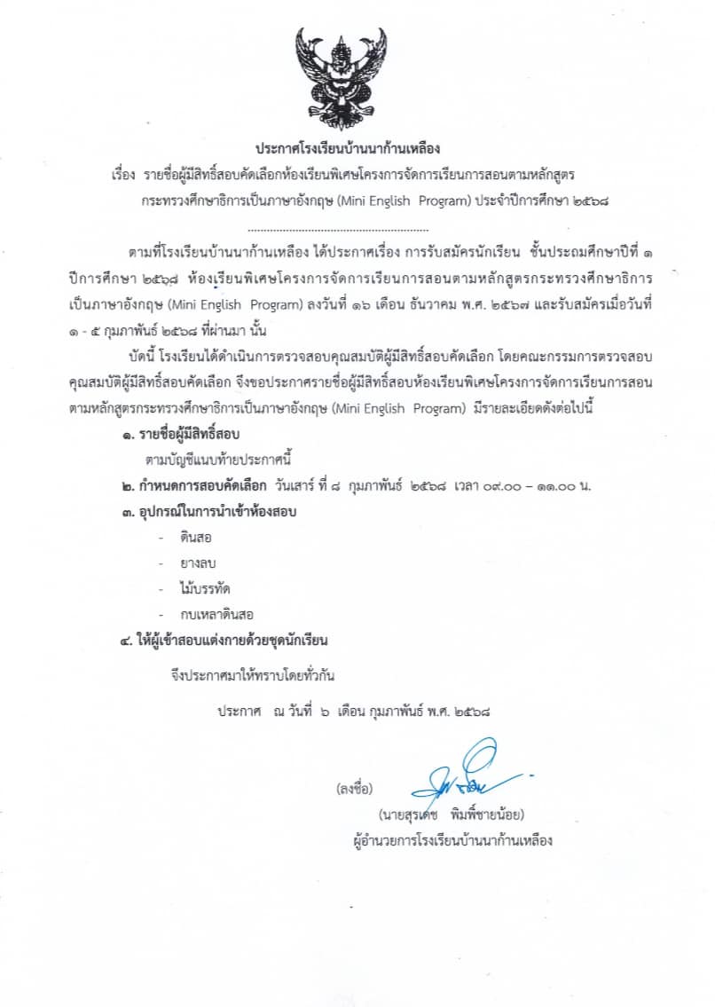 ประกาศรายชื่อผู้มีสิทธิ์สอบคัดเลือกห้องเรียนพิเศษ MEP1 ปีการศึกษา 2568