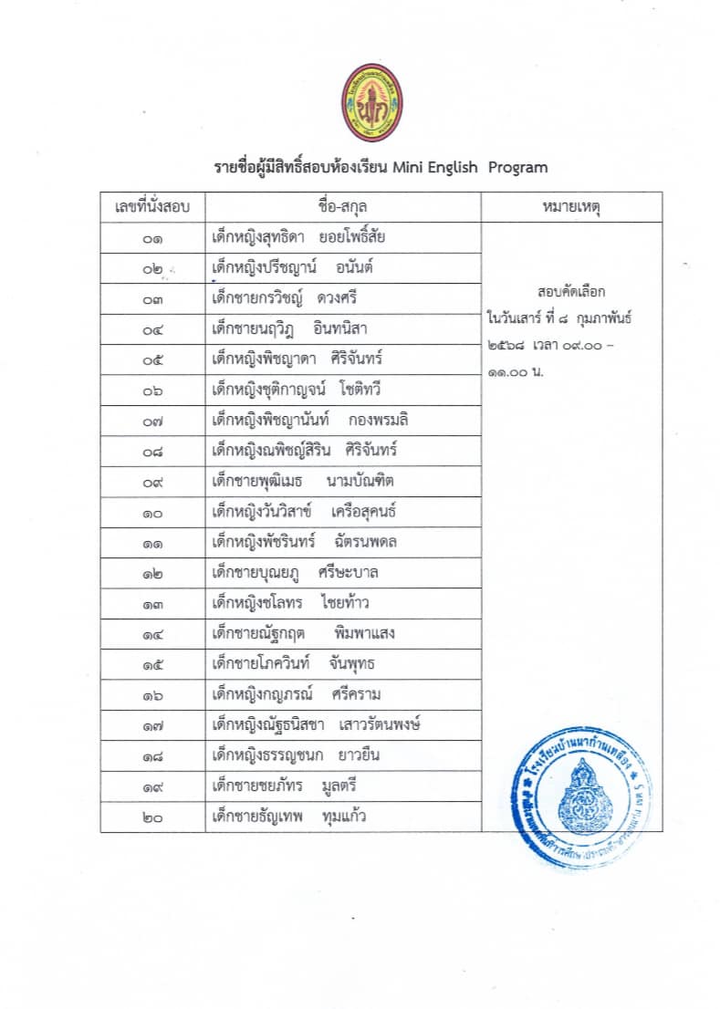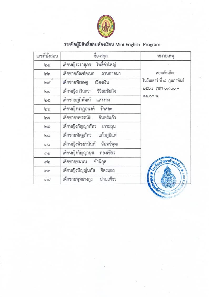 เรื่อง รายชื่อผู้มีสิทธิ์สอบคัดเลือกห้องเรียนพิเศษโครงการการจัดการเรียนการสอนหลักสูตรภาษาอังกฤษ